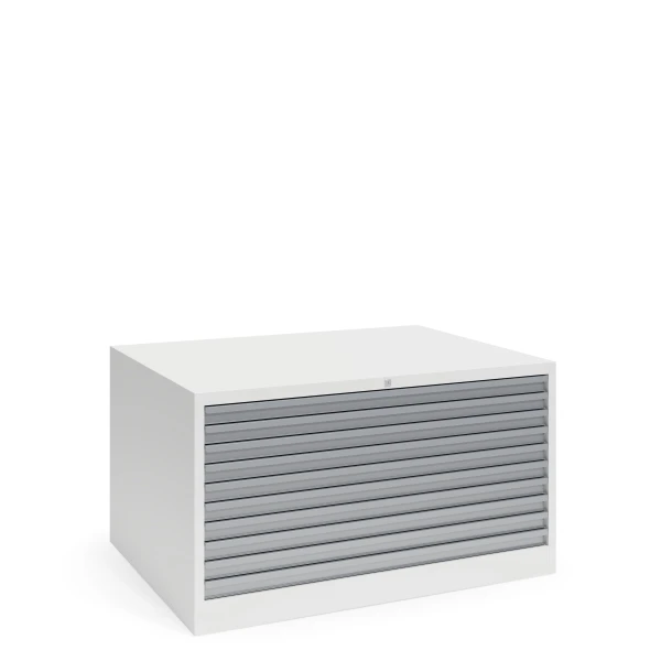File cabinet with 10 drawers designed for horizontal storing of maps and plans in A0 size.