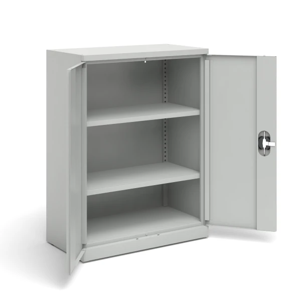 - 2-door low office cabinet is provided with 2 adjustable shelves. Perforated profiles inside the cabinet enable the shelf height to be adjusted every 25 mm,