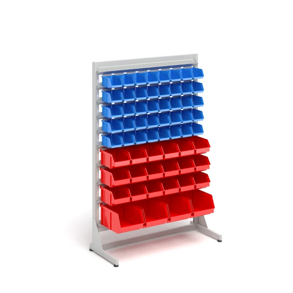 The frame is provided with 9 rows of mounting rails with workshop containers made of polypropylene, arranged as follows:
