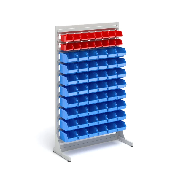 The frame is provided with 9 rows of mounting rails with workshop containers made of polypropylene, arranged as follows: