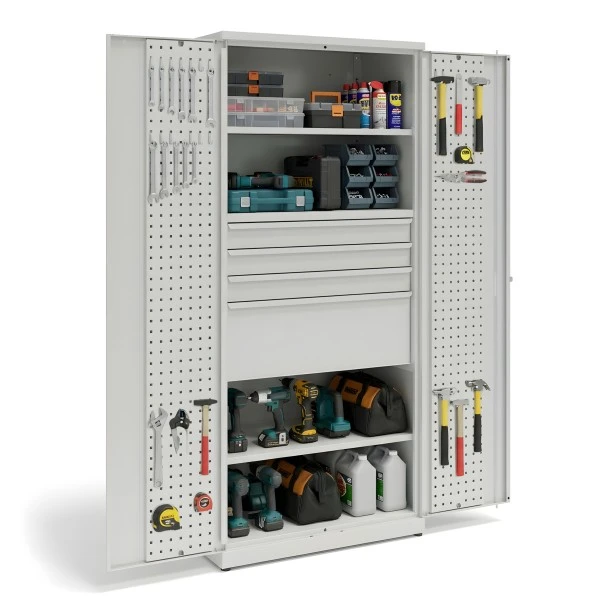 Tool cabinet with 2 adjustable shelves, 3 drawers 100 mm high, 1 drawer 300 mm high and perforated panels on the doors