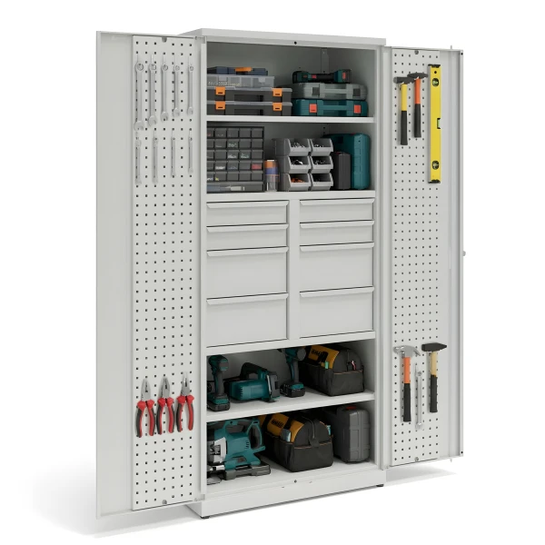 Tool cabinet with 2 adjustable shelves, 4 drawers 100 mm high, 4 drawers 200 mm high and perforated panels on the doors