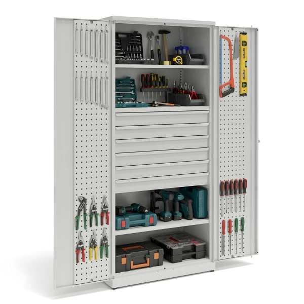 Tool cabinet with 2 adjustable shelves, 6 drawers 100 mm high and perforated panels on the doors