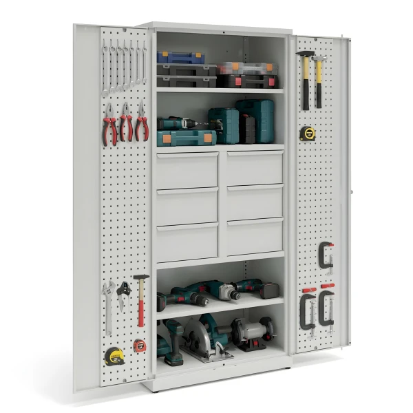 - workshop cabinet of solid structure with full double hinged doors, with perforated panels,