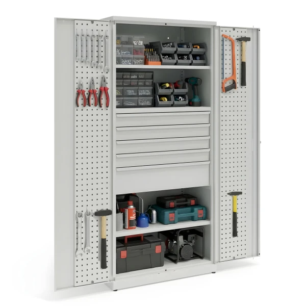 Tool cabinet with 2 adjustable shelves, one drawer 200 mm high, 4 drawers 100 mm high, and perforated panels on the doors