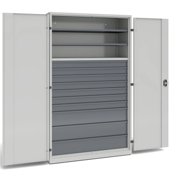 Workshop cabinet with 2 adjustable shelves, 1 permanently fixed shelf, 7 drawers 100 mm high, 3 drawers 200 mm high