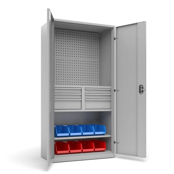 workshop cabinet of solid structure with double full hinged doors, with reinforcing profile,