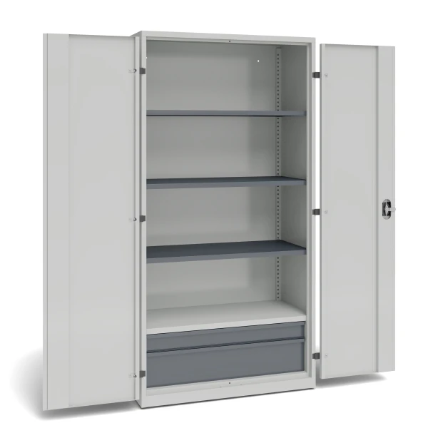 Workshop cabinet with 3 adjustable shelves, 1 permanently fixed shelf, drawer 100 mm high and drawer 200 mm high