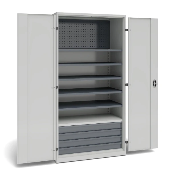 Workshop cabinet with 5 adjustable shelves, 1 permanently fixed shelf, perforated panel, 4 drawers 100 mm high