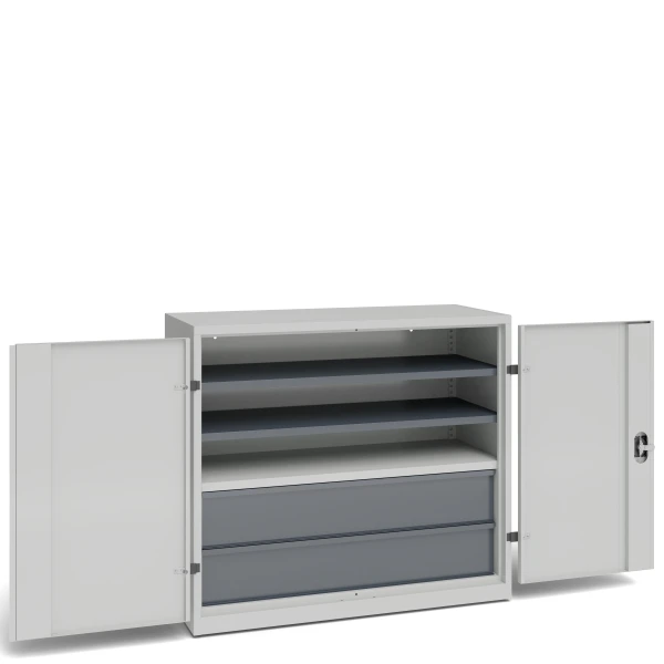 Workshop cabinet with full hinged doors, 2 adjustable shelves, 1 permanently fixed shelf, drawer 200 mm high