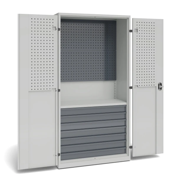 Workshop cabinet with full hinged doors, 2 perforated panels, 1 permanently fixed shelf, 7 drawers 100 mm high, perforated panels on the doors
