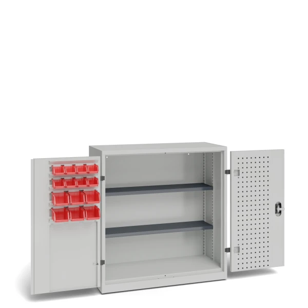 Workshop cabinet with full hinged doors, perforated panel, 2 adjustable shelves, containers PW 4- 6 units and PW 5- 8 units